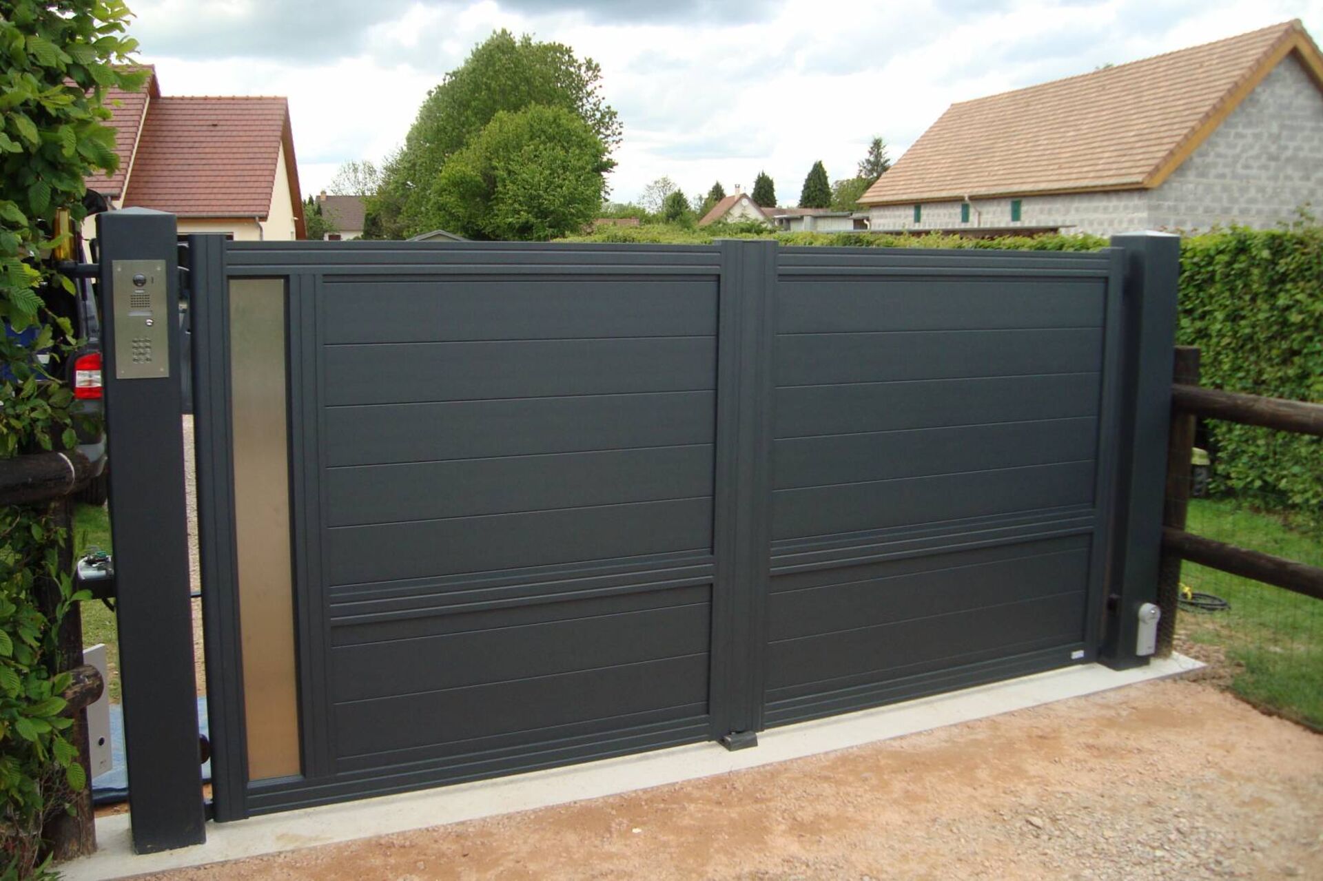 portails contemporains en aluminium s’adaptent à toutes les demandes : coloris, finitions, dimensions, systèmes d’ouverture (motorisée ou manuelle).