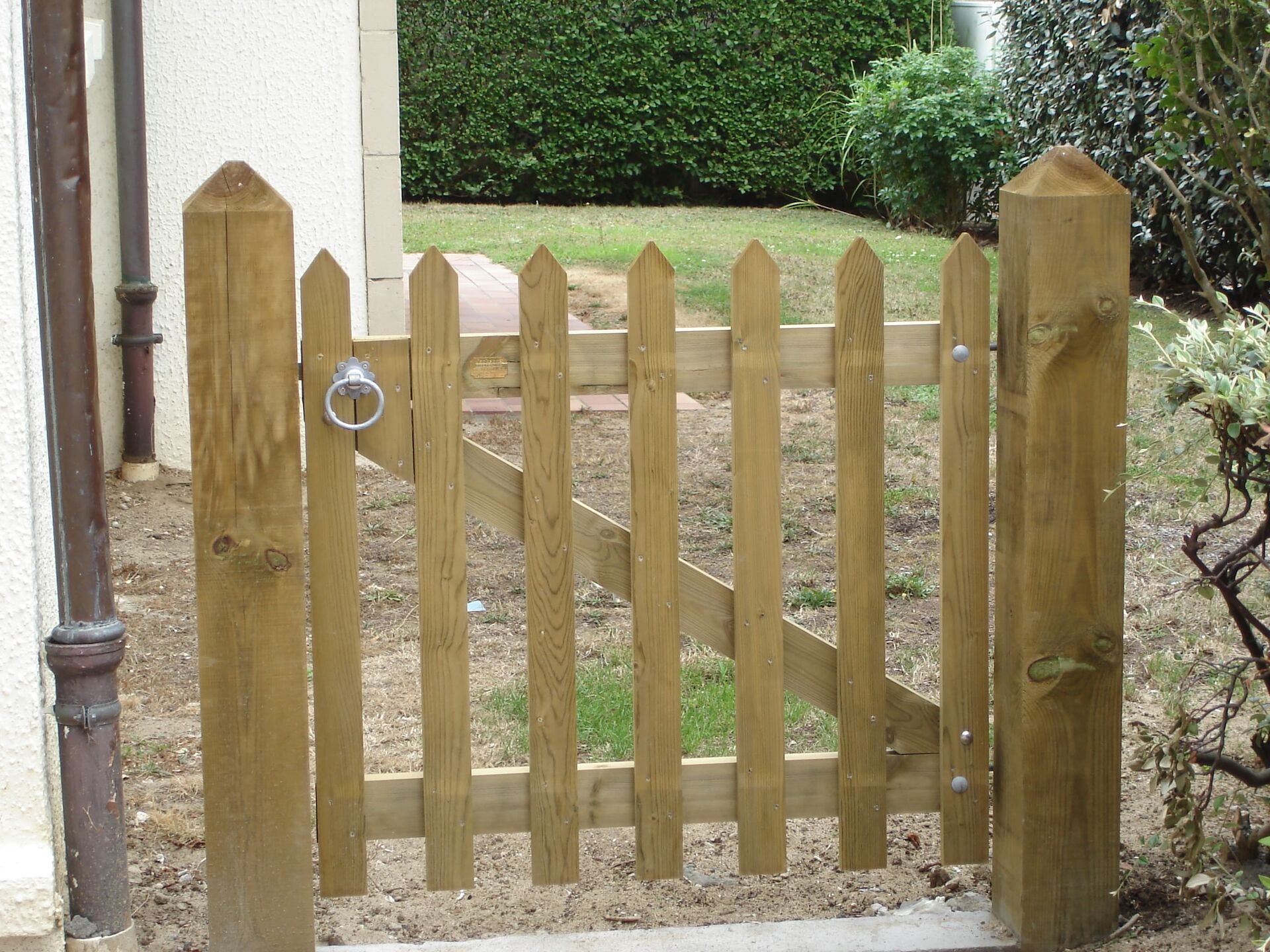 Chaque portillon en bois massif est monté sur des poteaux de forte section pour garantir une stabilité structurelle et une résistance optimale face aux intempéries.