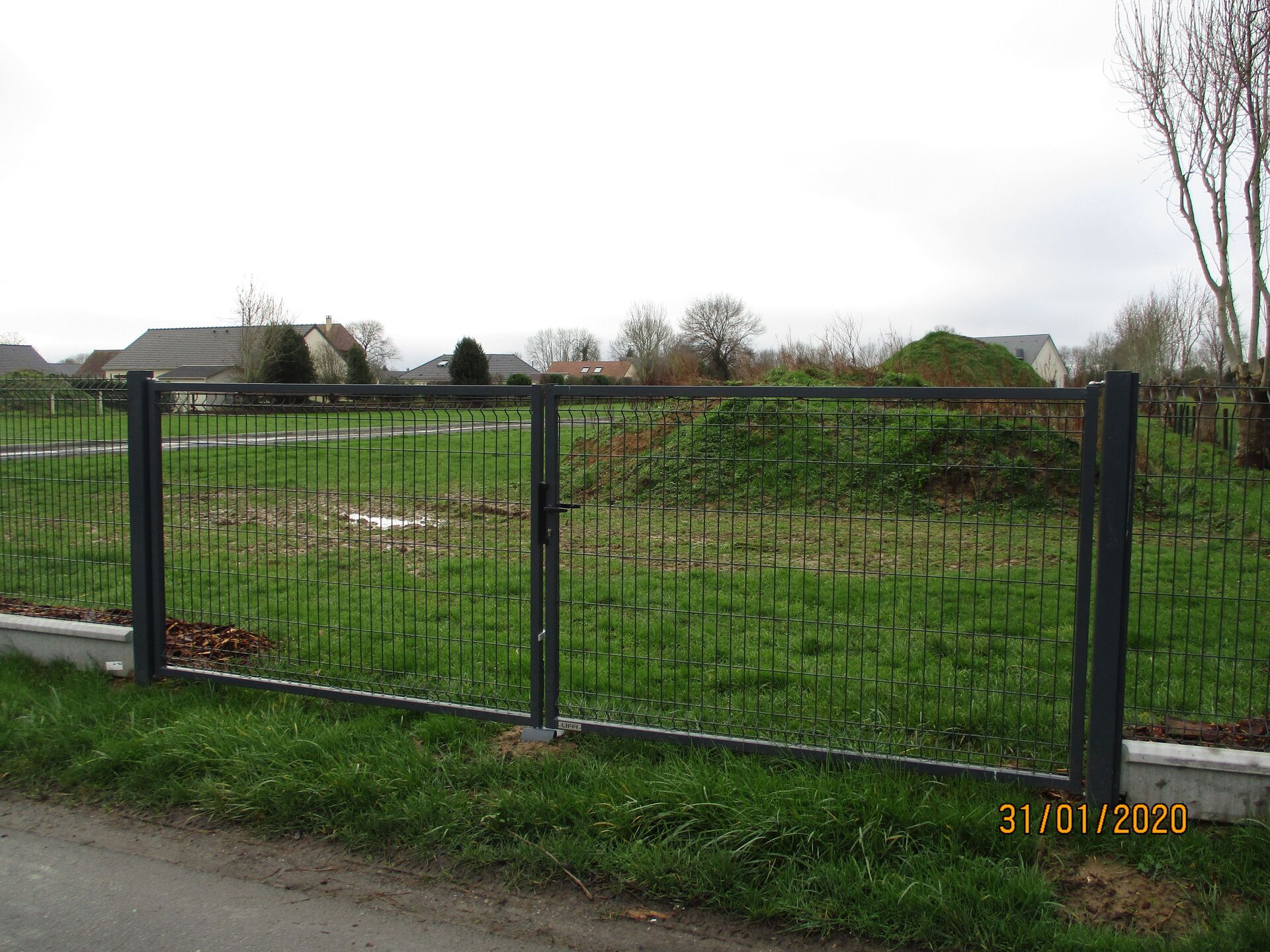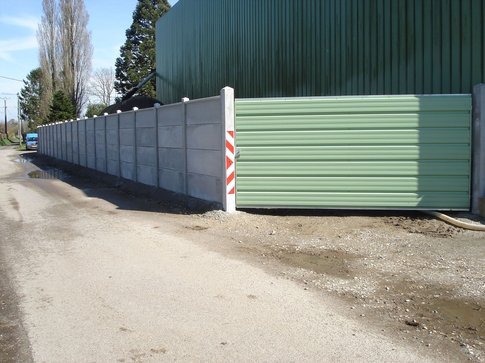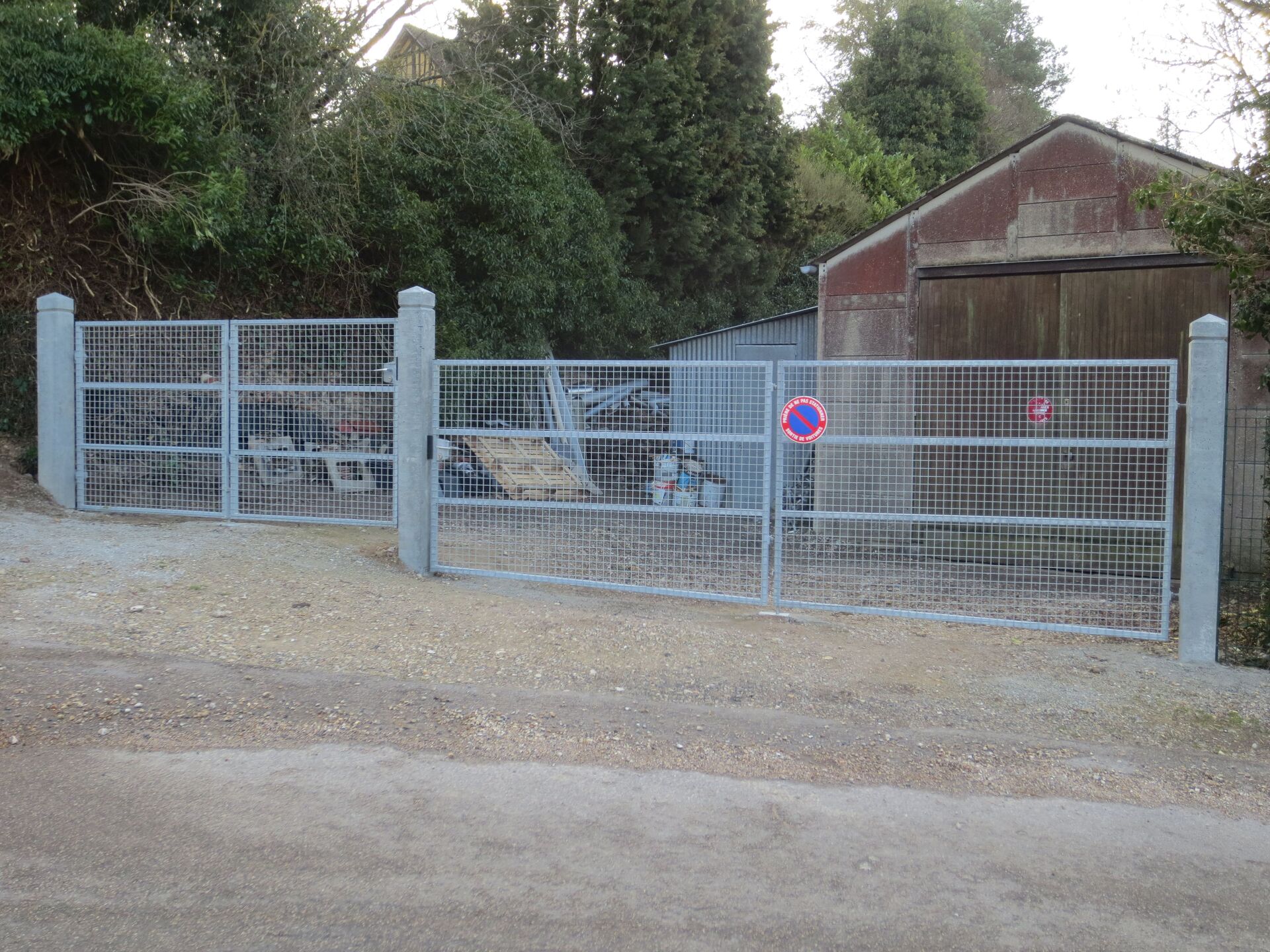 Chaque vantail est monté sur des gonds robustes avec un scellement précis des poteaux supports pour assurer la stabilité du linéaire.