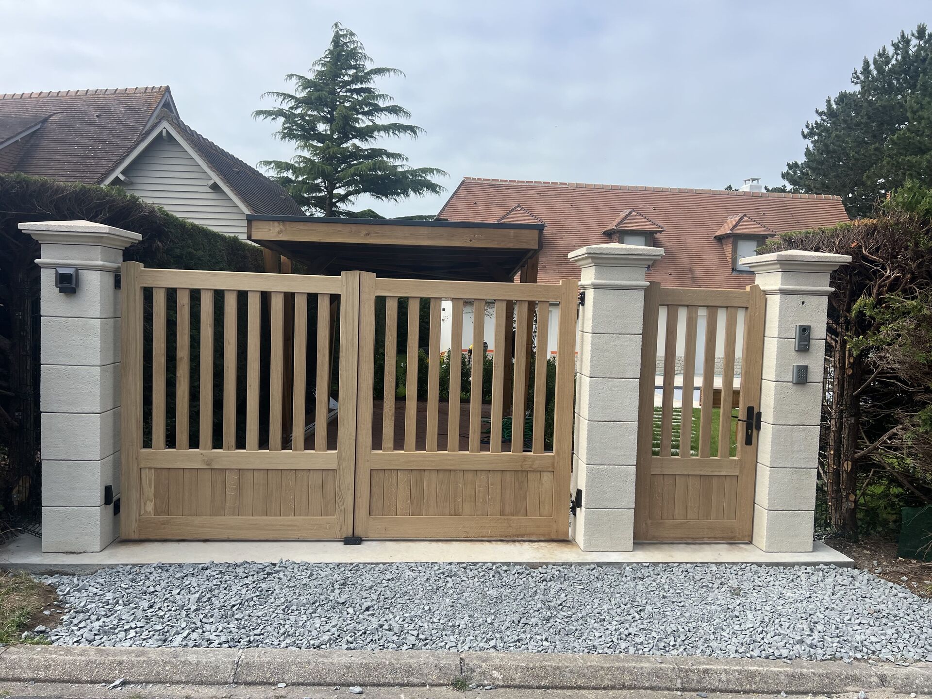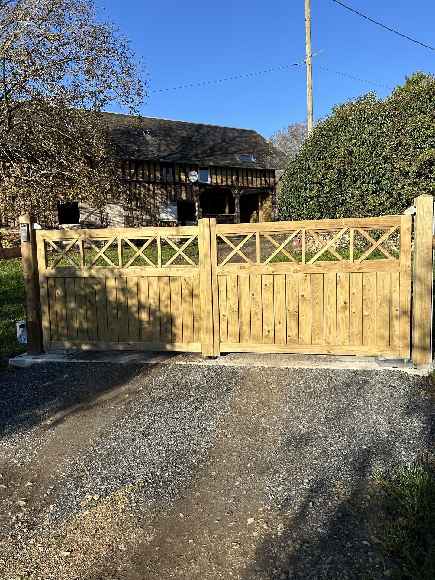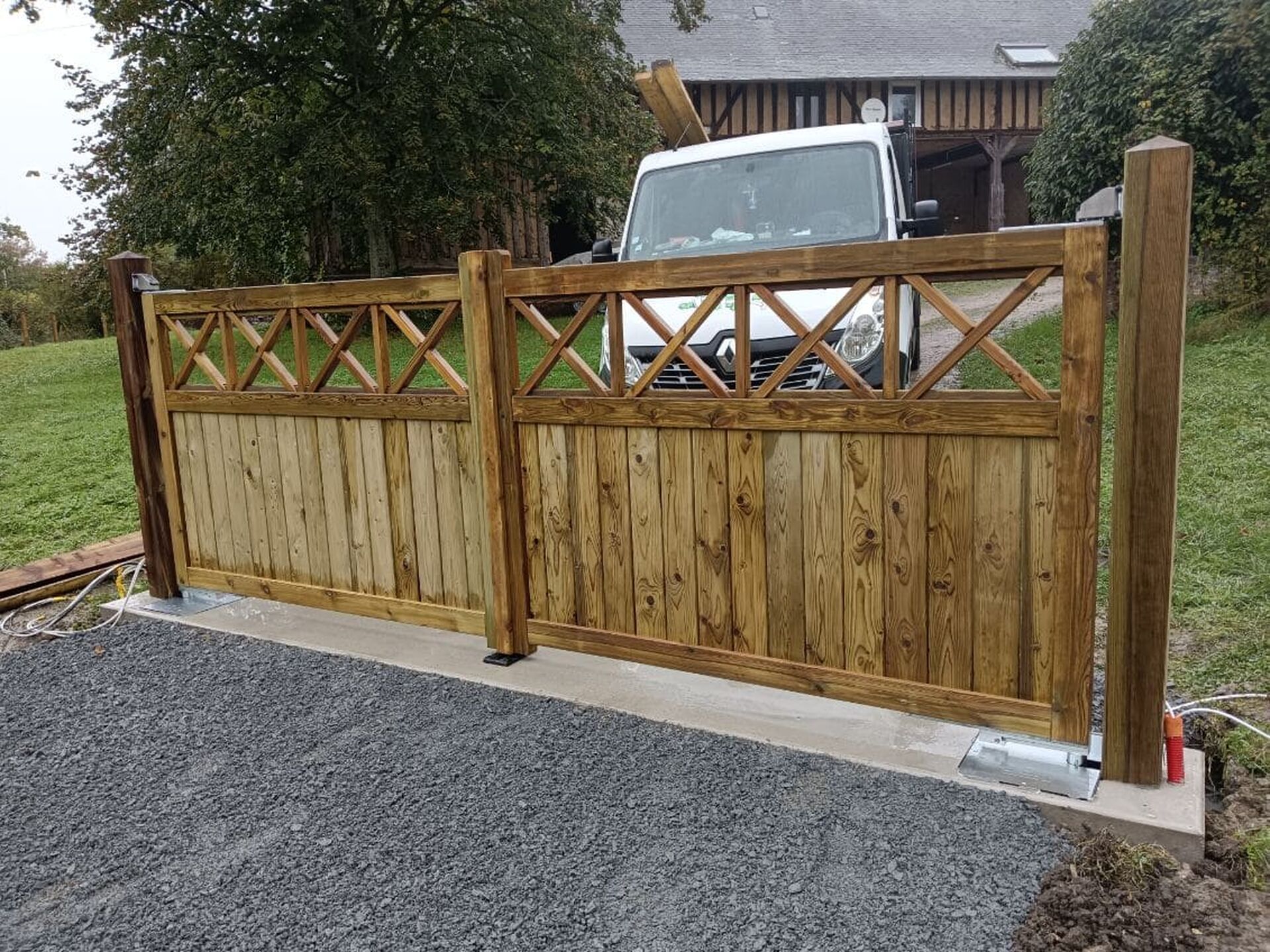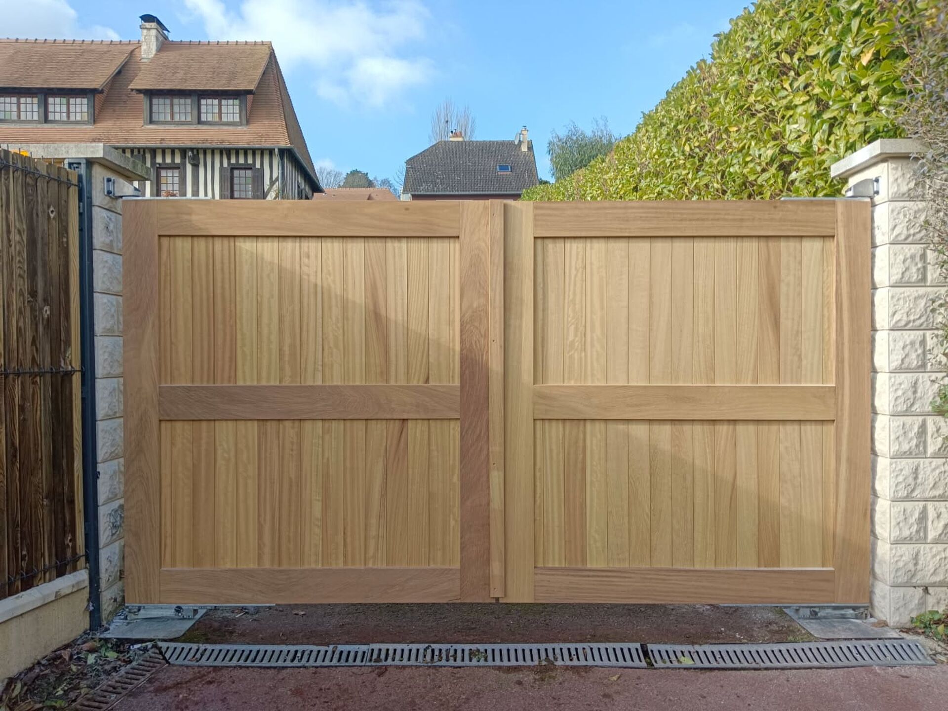 L'élégance naturelle du bois, associée à la modernité de la motorisation, est la signature d'un accès réussi. À Rouen en Seine-Maritime 76 et Barentin, Clôtures Bataille, entreprise spécialisée dans l'installation de garde-corps et aménagements extérieurs, réalise des entrées qui valorisent l'habitat. Nous assurons la Pose de Portail Motorisé en Bois Noble, Modèle 2 Vantaux Sur-Mesure pour garantir une intégration parfaite.
